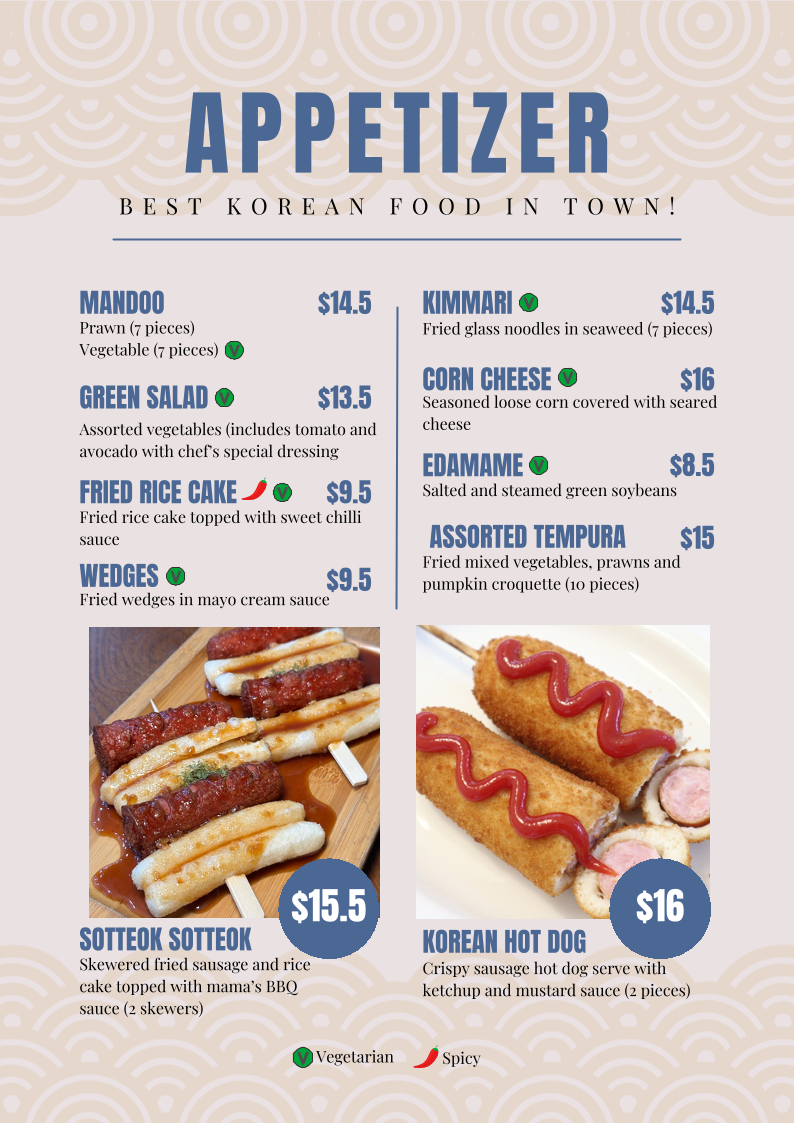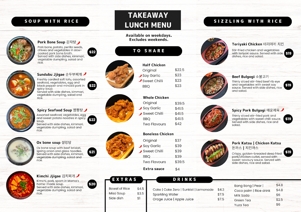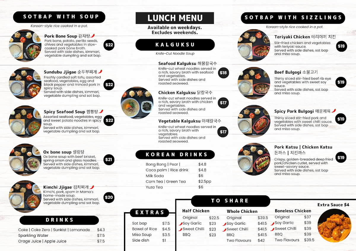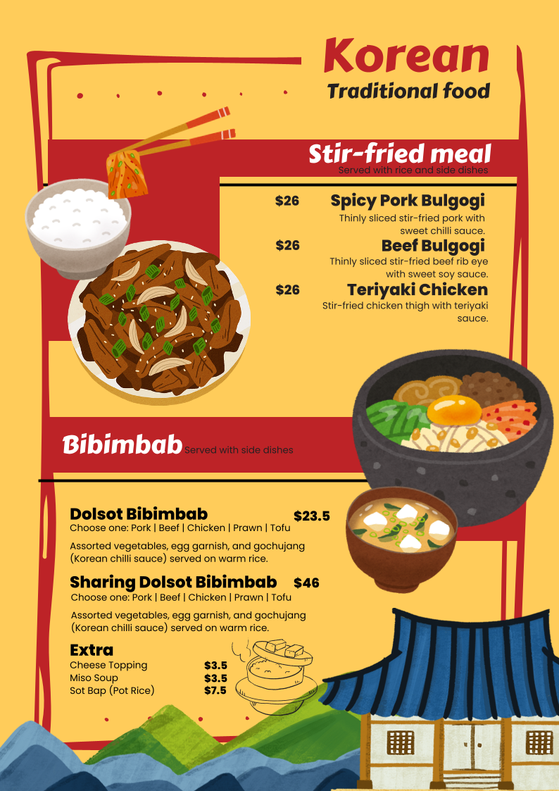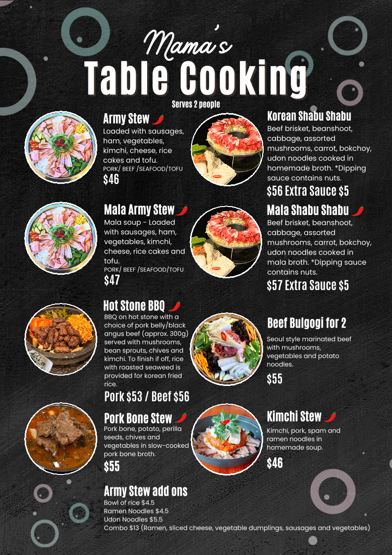 Kimchi, pork, spam in Mama's home-made soup. Served with side dishes, kimmari, vegetable dumpling, salad and rice.
